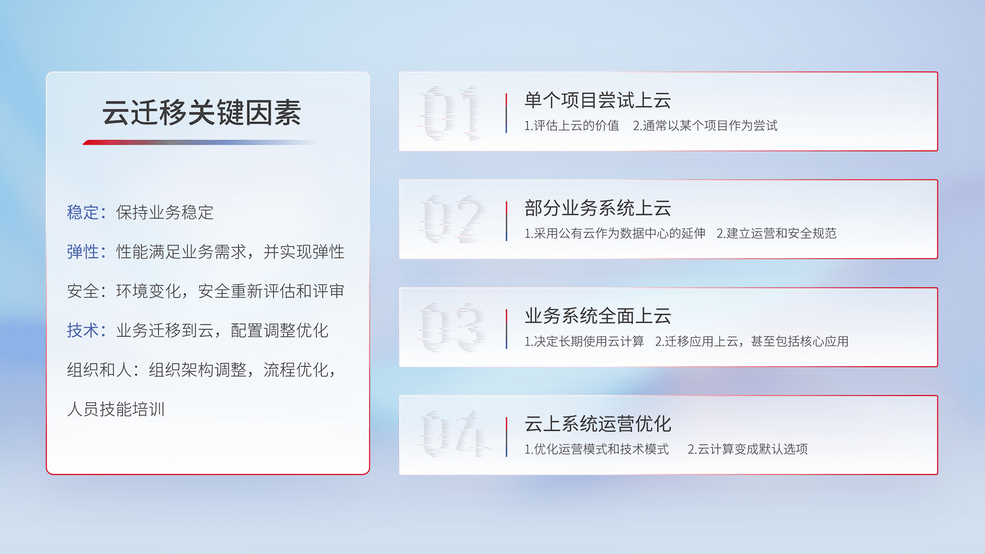 结合实际业务,,,,从规划设计、、、云平台选型、、、、云原生改造、、、、数据迁移、、集成交付,,,,迁移全过程为客户识别最佳上云路径,,,,做好风险识别管理,,设计网络架构、、、、身份权限、、、安全审计合规、、、操作审计、、日志审计、、、、监控告警策略、、、多站点容灾设计等,,对云上基础设施进行整体规划,,,提升IT治理水平,,以满足弹性、、、高可用、、、高性能的需求。。。